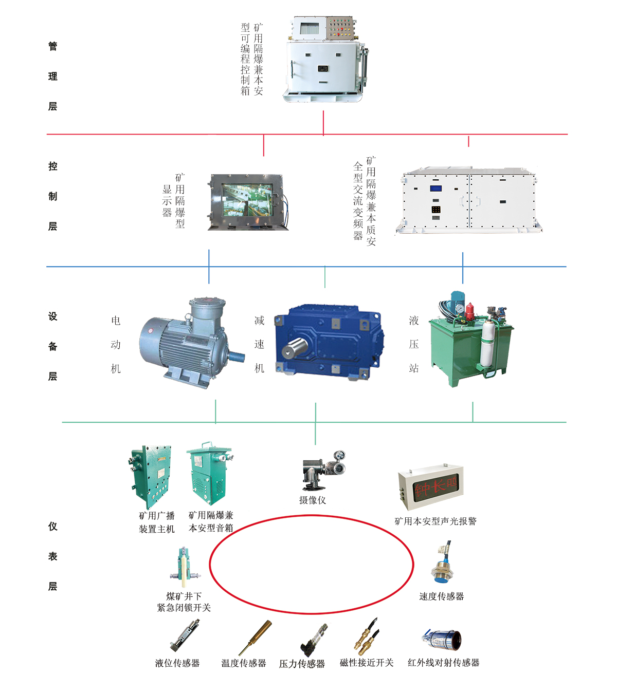 架空乘人裝置電氣控制系統(tǒng)(俗稱(chēng)“猴車(chē)電控”)由礦用隔爆兼本質(zhì)安全型交流變頻器、礦用隔爆兼本安型可編程控制箱、礦用隔爆型顯示器、傳感器及攝像儀等組成。系統(tǒng)配備的人機(jī)界面可顯示架空乘人裝置的運(yùn)行狀態(tài)、安全保護(hù)、故障編碼、故障位置及歷史記錄,系統(tǒng)具有可擴(kuò)展、自診斷、語(yǔ)言告警等功能。
